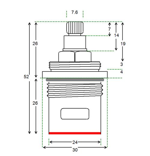 BSP half inch threaded flange with 24 teeth x 48mm overall height and spline height of 10 mm x 9.2 mm spline dia. Tap Magician are the UK experts in ceramic disc tap cartridges and leaky taps. We offer high quality fully compatible tap valve spares for most UK kitchen, basin, bath and shower mixers. Easily repair and doctor your leaking or dripping hot and cold taps. Traditional or ceramic valve type. We have experienced advisors available for any technical support you need help or advice with. We stock the spare parts for all of our valves for easy and cheap low cost future maintenance (ceramic disc internals and silicone seals and washers and o'rings). We offer a 12 month warranty on all of our products.