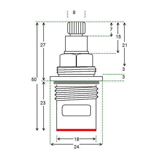 BSP half inch threaded flange with 24 teeth x 46mm overall height and spline height of 9 mm x 7.6 mm spline dia. Tap Magician are the UK experts in ceramic disc tap cartridges and leaky taps. We offer high quality fully compatible tap valve spares for most UK kitchen, basin, bath and shower mixers. Easily repair and doctor your leaking or dripping hot and cold taps. Traditional or ceramic valve type. We have experienced advisors available for any technical support you need help or advice with. We stock the spare parts for all of our valves for easy and cheap low cost future maintenance (ceramic disc internals and silicone seals and washers and o'rings). We offer a 12 month warranty on all of our products.