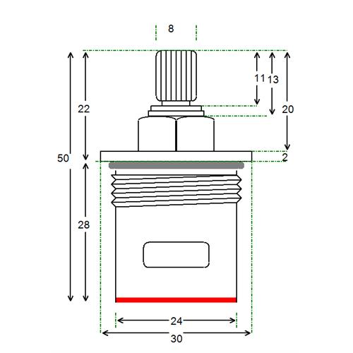 BSP half inch threaded flange with 24 teeth x 43mm overall height and spline height of 7 mm x 7.6 mm spline dia. This product is suitable for 1/2" x 24 x 43mm. Tap Magician are the UK experts in ceramic disc tap cartridges and leaky taps. We offer high quality fully compatible tap valve spares for most UK kitchen, basin, bath and shower mixers. Easily repair and doctor your leaking or dripping hot and cold taps. Traditional or ceramic valve type. We have experienced advisors available for any technical support you need help or advice with. We stock the spare parts for all of our valves for easy and cheap low cost future maintenance (ceramic disc internals and silicone seals and washers and o'rings). We offer a 12 month warranty on all of our products.